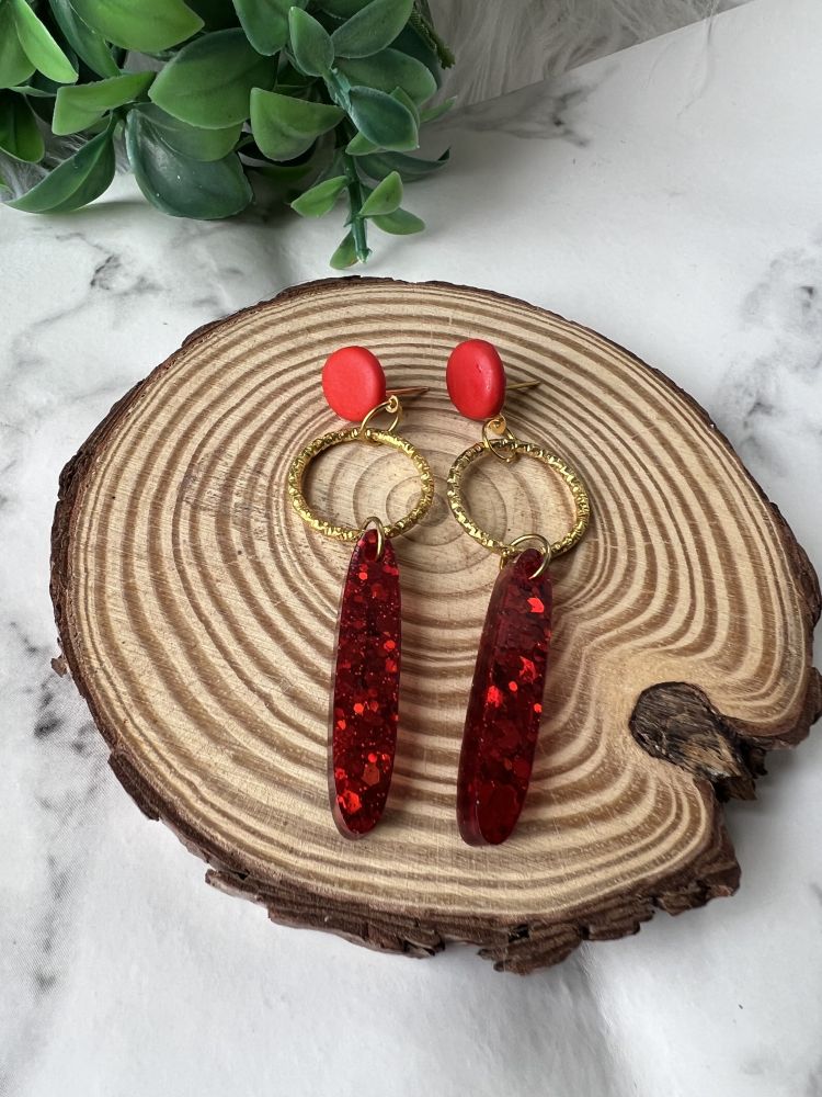 Long dangling earrings,handmade with resin,glitter and polymer clay.